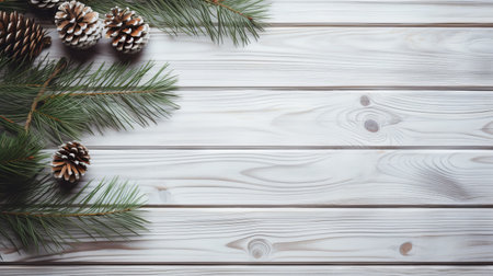 flat lay composition featuring pine branches on a rustic white wood floor background. this elegant and soft-toned photograph is captured from a top view, with ample copy space. the high-quality image is shot in 8k resolution, showcasing the intricate details and enhanced by studio lighting. perfect for various photography projects. ai generated