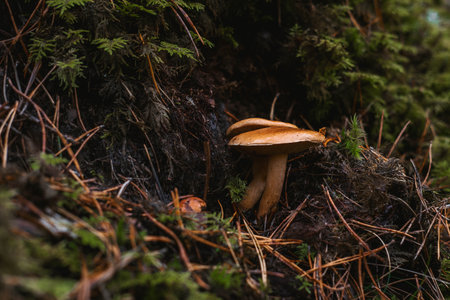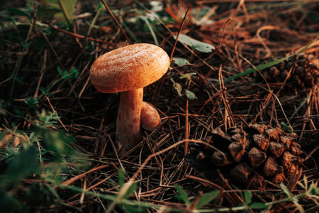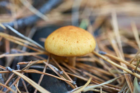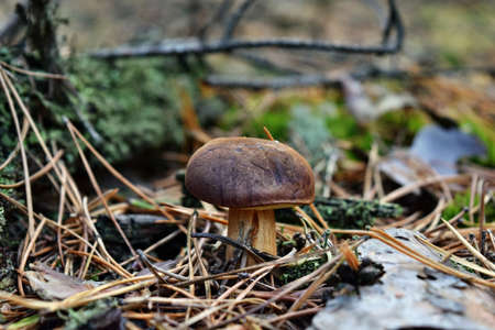 Young slippery Jack Fungi, Suillus luteus on autumn forest background with pine needles, close-up view. Harvest mushroom concept