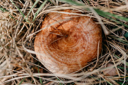 Detail of a mushroom, niscalo, of the forest floor in the middle of the mountain with pine leaves with brown, orange and green colors