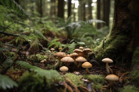 close-up of forest floor, with mushrooms and ferns in the foreground, created with generative ai