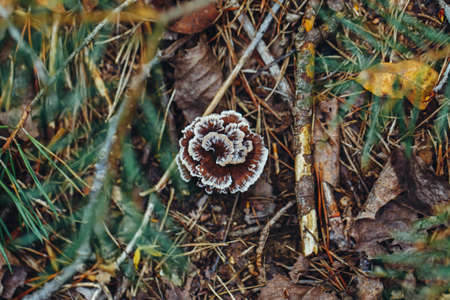 Macro of beautiful small red yellow turkey tail mushroom in autumn forest grass moss. View from top above. Fungus boletus in wood. Sunny day in country rural are.