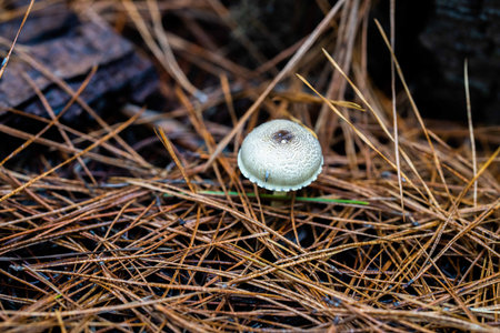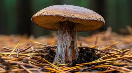 A solitary wild mushroom stands tall amidst a bed of fallen pine needles. Its earthy tones blend seamlessly with the natural forest environment.