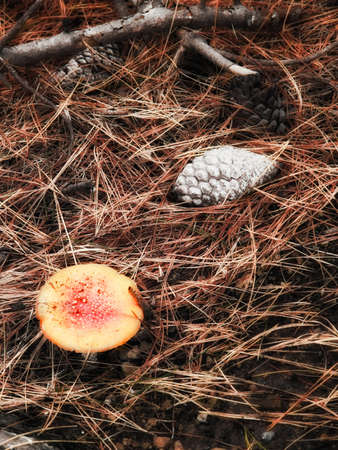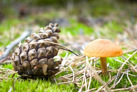 A small mushroom in a pine forest next to a pine cone grows in moss. Pine dry needles on a mushroom head.