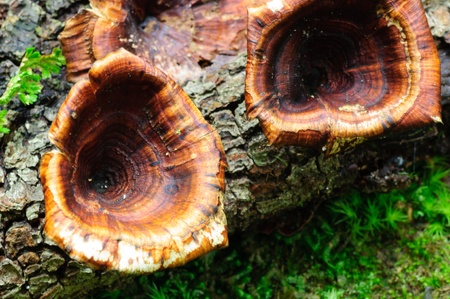 A close up of the mushrooms tinders on dead trunk of tree