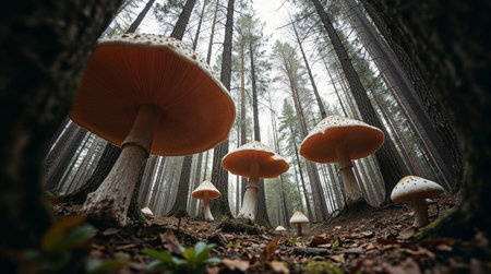 Low angle view of umbrella mushrooms growing on a forest floor, surrounded by tall trees. Ai generated image