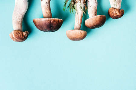 Fresh forest boletus mushrooms on blue background. Top view. Copy space. Autumn harvest concept. Fresh picked Porcini mushrooms in basket