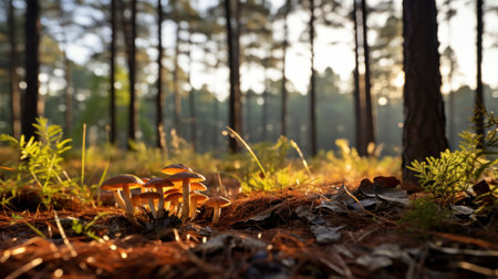 A cluster of mushrooms thrives on the forest floor. Sunlight filters through the trees creating a magical atmosphere.