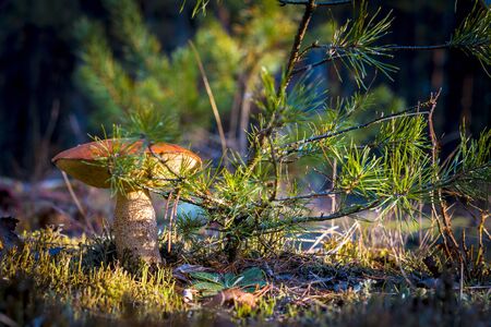 edible porcini mushroom in a forest glade close-up under the light of sunlight with beautiful bokeh