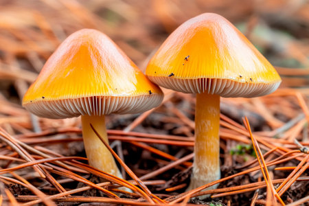 Two vibrant orange mushrooms rise gracefully from a bed of soft pine needles in a sunlit forest. The delicate features of the mushrooms contrast beautifully with the earthy surroundings.