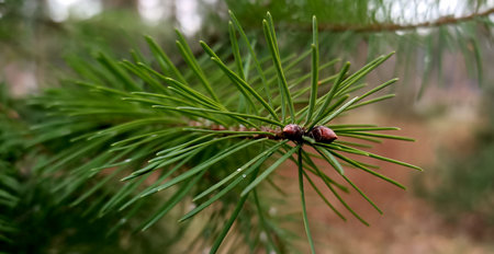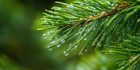 A breathtaking closeup view of a lush pine branch elegantly adorned with glistening dew drops, beautifully showcasing the incredible splendor of nature and its serene environment