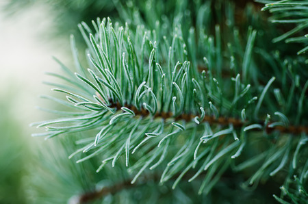 Closeup shot of pine tree needles with selective focus and blurry background. Abstract nature shot.