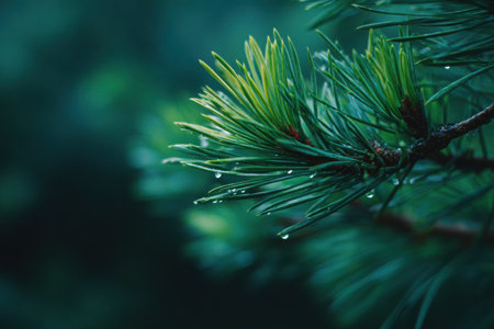 Close-up of a fresh pine branch featuring glossy green needles adorned with dew drops, evoking a festive ambiance ideal for holiday themes and decorations