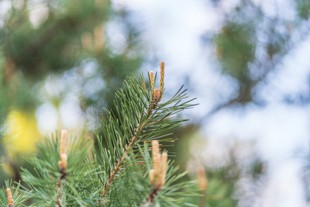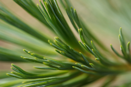 close uo macro image of pine tree fresh leaves blooming in spring