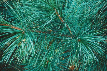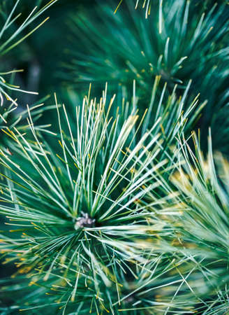 Green pine tree branches and needles close view with blurred natural background
