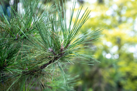 Pine tree branches and needles on blurred bokeh background