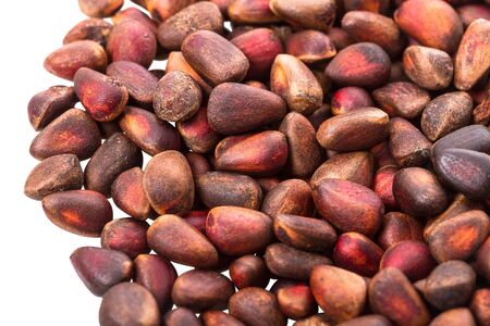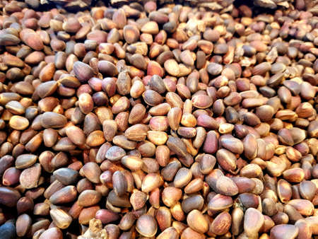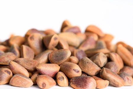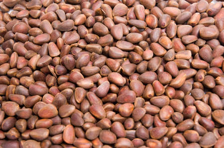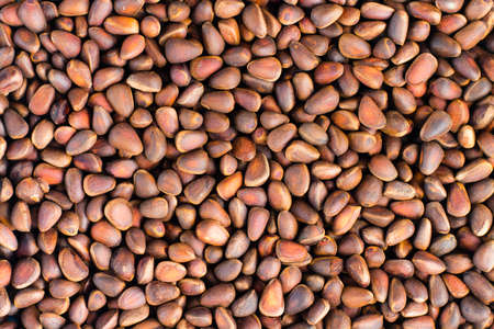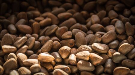 Cedar pine nuts background, in shells, not peeled, Close-up, macro
