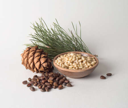 Cedar cones, unshelled pine nuts in glass bowl on white wooden table.