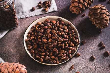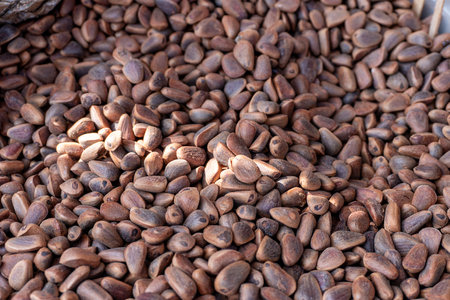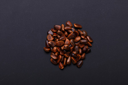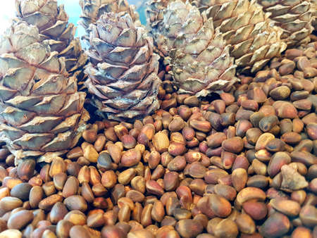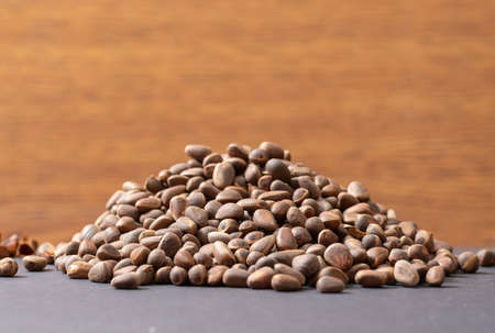 Close-up of unpeeled pine nuts, you can see the shell of a Siberian nut. Dark brown seeds, cones, blurred foreground and background.