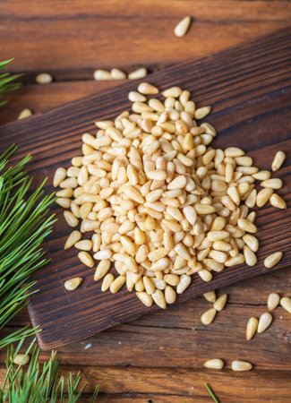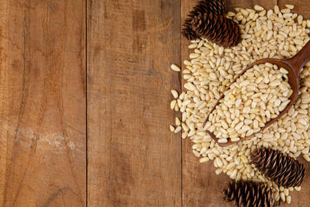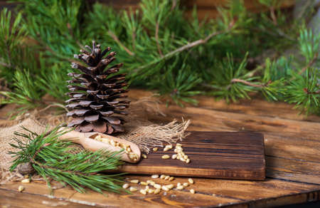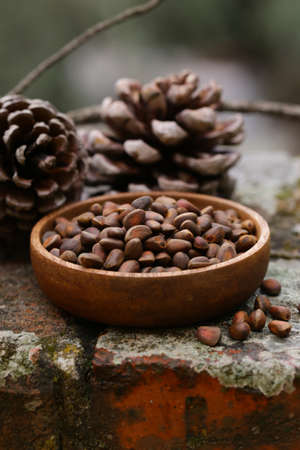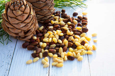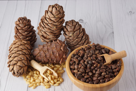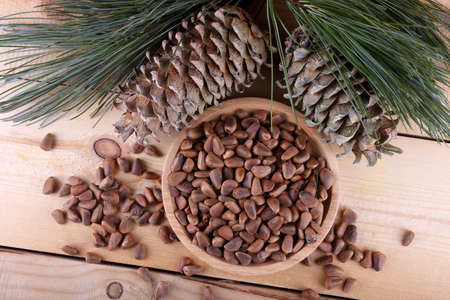 Peeled and unrefined pine nuts and cedar cones on a wooden table
