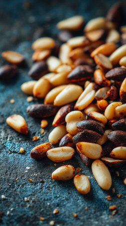 Nuts lying on the table by the handful.Tasty treats on a wooden