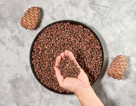 Cedar or pine nuts in a bowl with cones on gray background, top view
