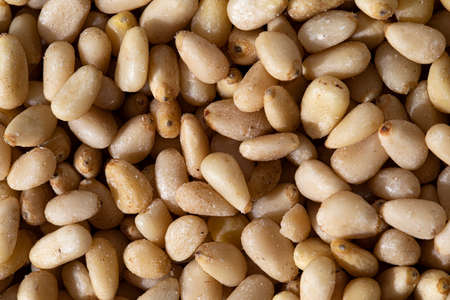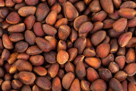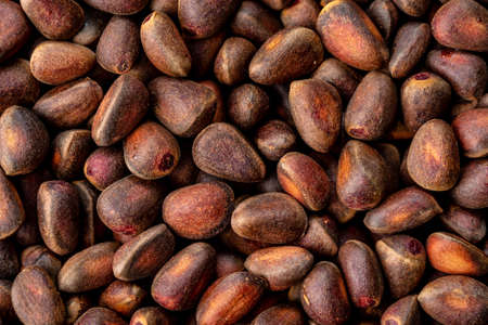 Background of pine nuts from Siberia close-up, you can see all the details of the shell. Top view of scattered nuts. For cooking, recipes.