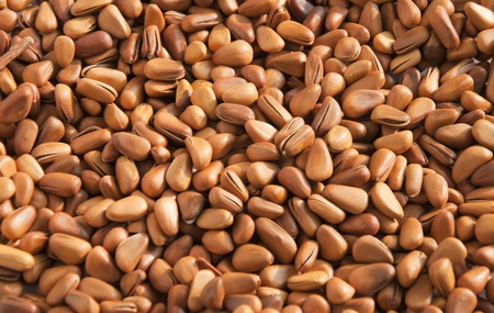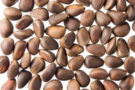 Background of whole pine nuts. Lots of cedar seeds in their shells. Top view.