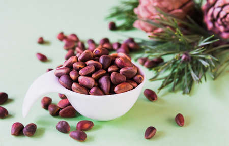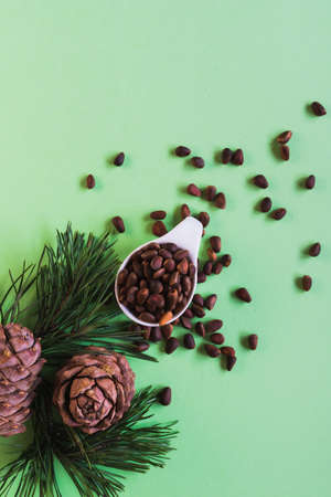 Unpeeled Siberian cedar nuts and cones with needles on a green background. The concept of healthy regional nutrition. Omega 3 acids