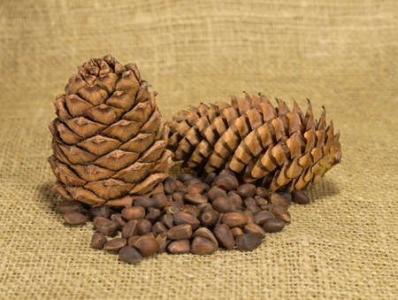 Cedar nuts, shell and Siberian pine cone. Peeled kernels lie on a wooden cutting gloss of hevea.