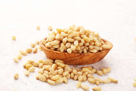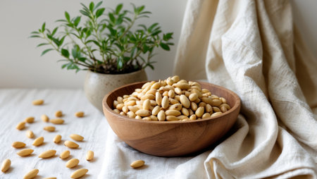 AI Generated. Pine nuts in a wooden bowl on a white table with a kitchen towel and green plant in the background