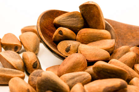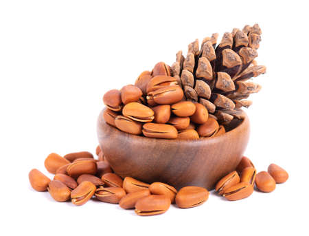 Pine nuts in wooden bowl, isolated on white background. Pine cones and heap of roasted pine nuts in shells.