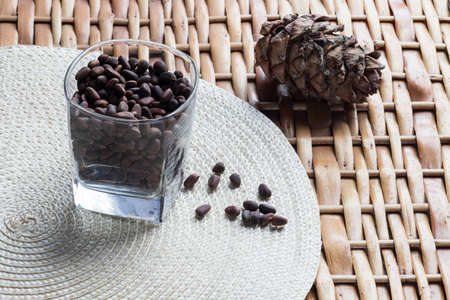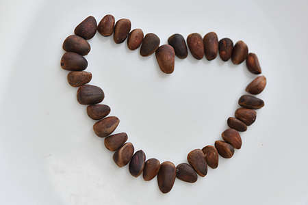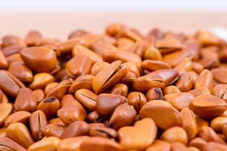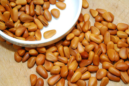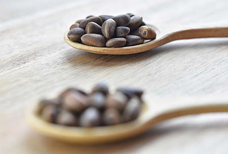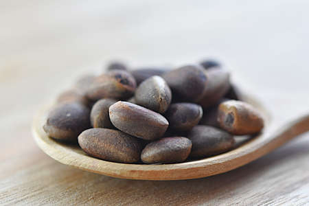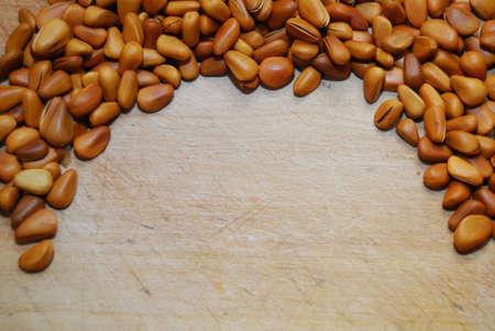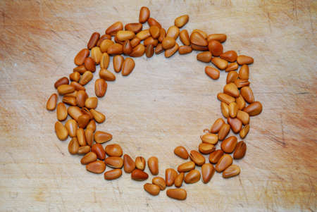 pine nut seed on rustic wooden table. Brazilian cuisine, consumed in winter and June parties.