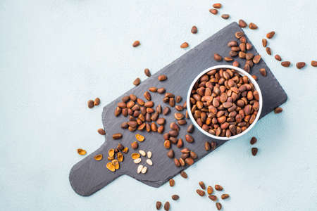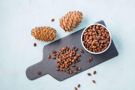 Unpeeled pine nuts and cones on a slate board and in a bowl. Gifts of Siberia. Detox and cure for insomnia. Healthy vitamin nutrition. Top view