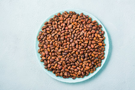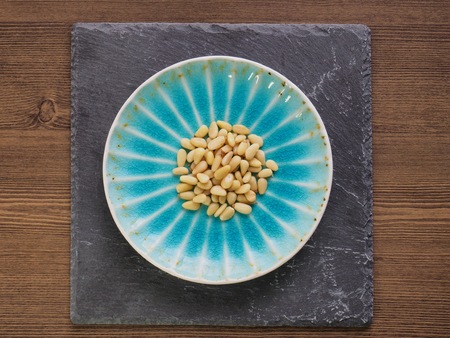 Unshelled pine nuts on a blue plate. Remedy for insomnia and detox food. Vitamins and health. Top view