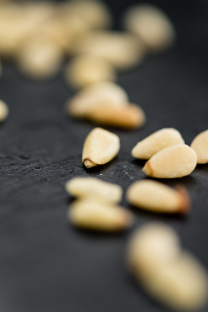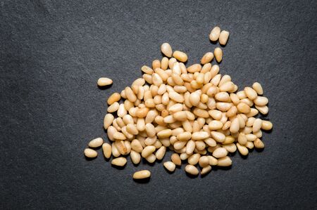 Several peeled pine nuts among the nuts in the shell and a bowl of nuts on a slate board. Remedy for insomnia and detox food. Vitamins and health. Top view