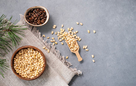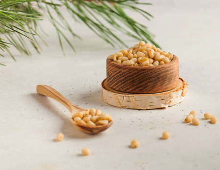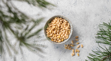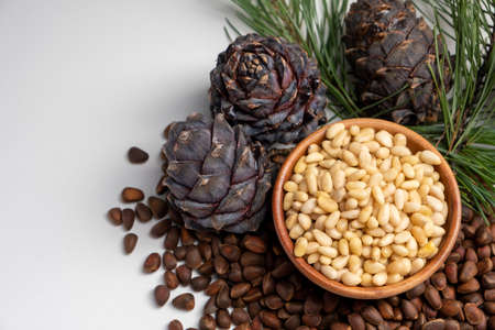 Pine nuts in a bowl and a scattered on a light background with branches of pine needles. The concept of a natural, organic and healthy superfood and snack. Top view and copy space.