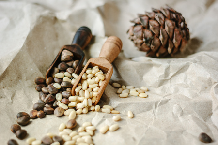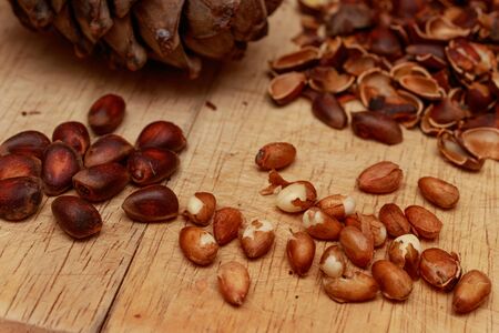 Cedar nut kernels, cedar nut shells. Cedar nut on wooden background.