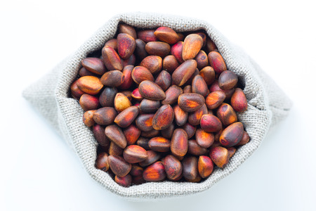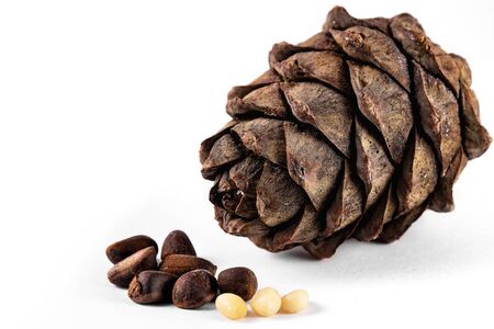 one cedar cone, pinus sibirica peeled nuts on the white background