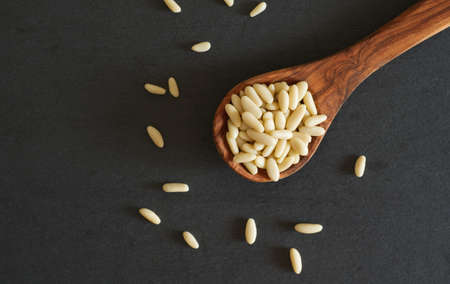 spice jar with pine nuts close-up shot of pantry ingredients, concept of simple toppings to flavour your dishes