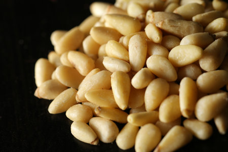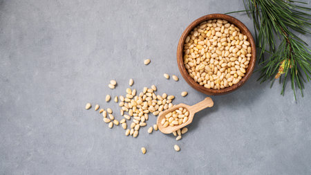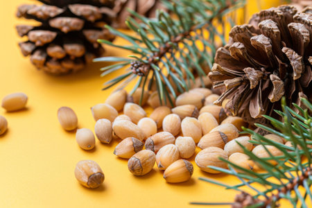 A delightful arrangement of pine nuts scattered across a vivid yellow backdrop, highlighting their unique shapes and earthy tones. These nuts evoke a sense of warmth and nature.
