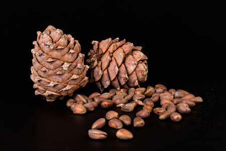 Cedar nuts in the shell with unopened cones isolated on the black background