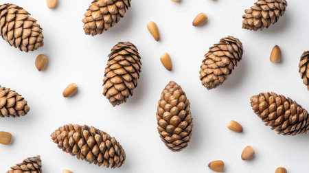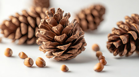 Close-up of cedar cones with scattered pine nuts on white surface, emphasizing rich brown textures and organic shapes