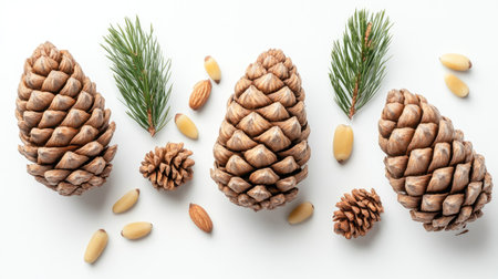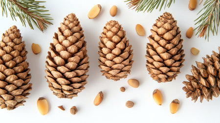 Overhead view of cedar cones with pine nuts scattered around, photographed on white backdrop for educational or culinary concept
