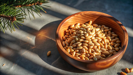 Pine nuts in a wooden bowl on the background of the Christmas tree