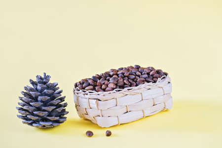 unpeeled cedar nuts in wicker basket next to cone on yellow background. rich in unsaturated fats food for brain boost and heart health. raw food for paleo diet. vegetarian meal plan