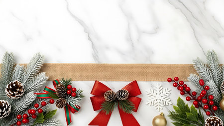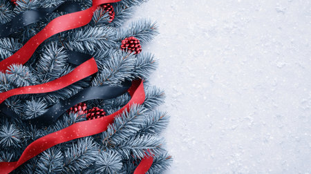 Christmas background for greeting card. Christmas tree branches with snow effect with festive red ribbon, on white marble background, top view copy space