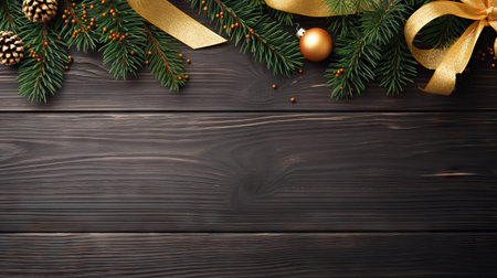 Christmas background with fir tree branches and golden ribbon on dark wooden board Generative AI
