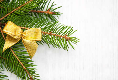 Green natural spruce branch and gold bow on a white background. Postcard with copy space. Christmas and New Year concept