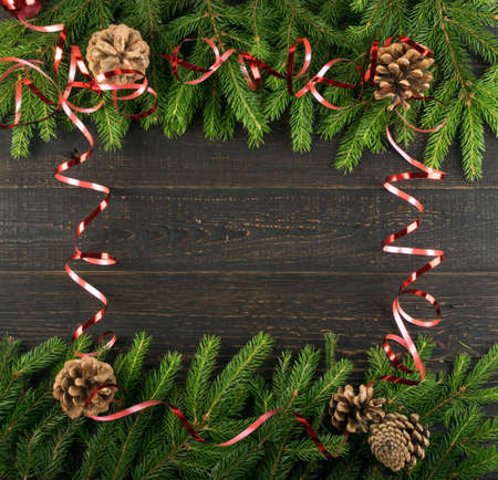 Christmas background with fir branches, pine cones and christmas decorations on dark wooden background.