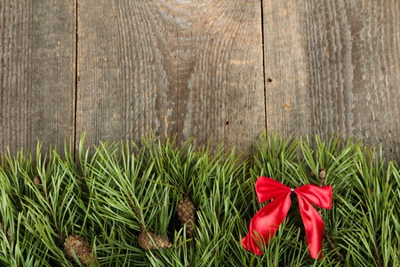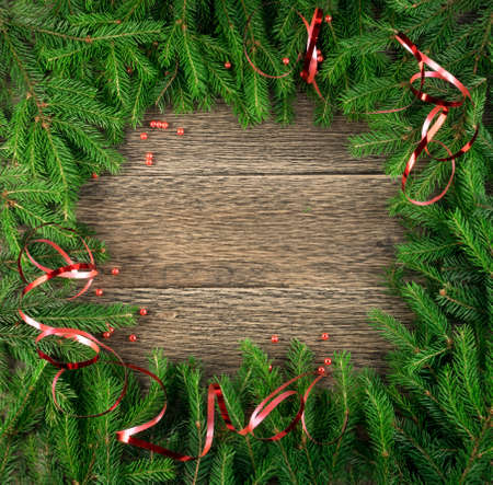 Christmas background with fir branches on vintage wooden backdrop flat lay and top view. Yuletide floral frame decoration with copy space. Creative xmas tree border for New Year greeting card